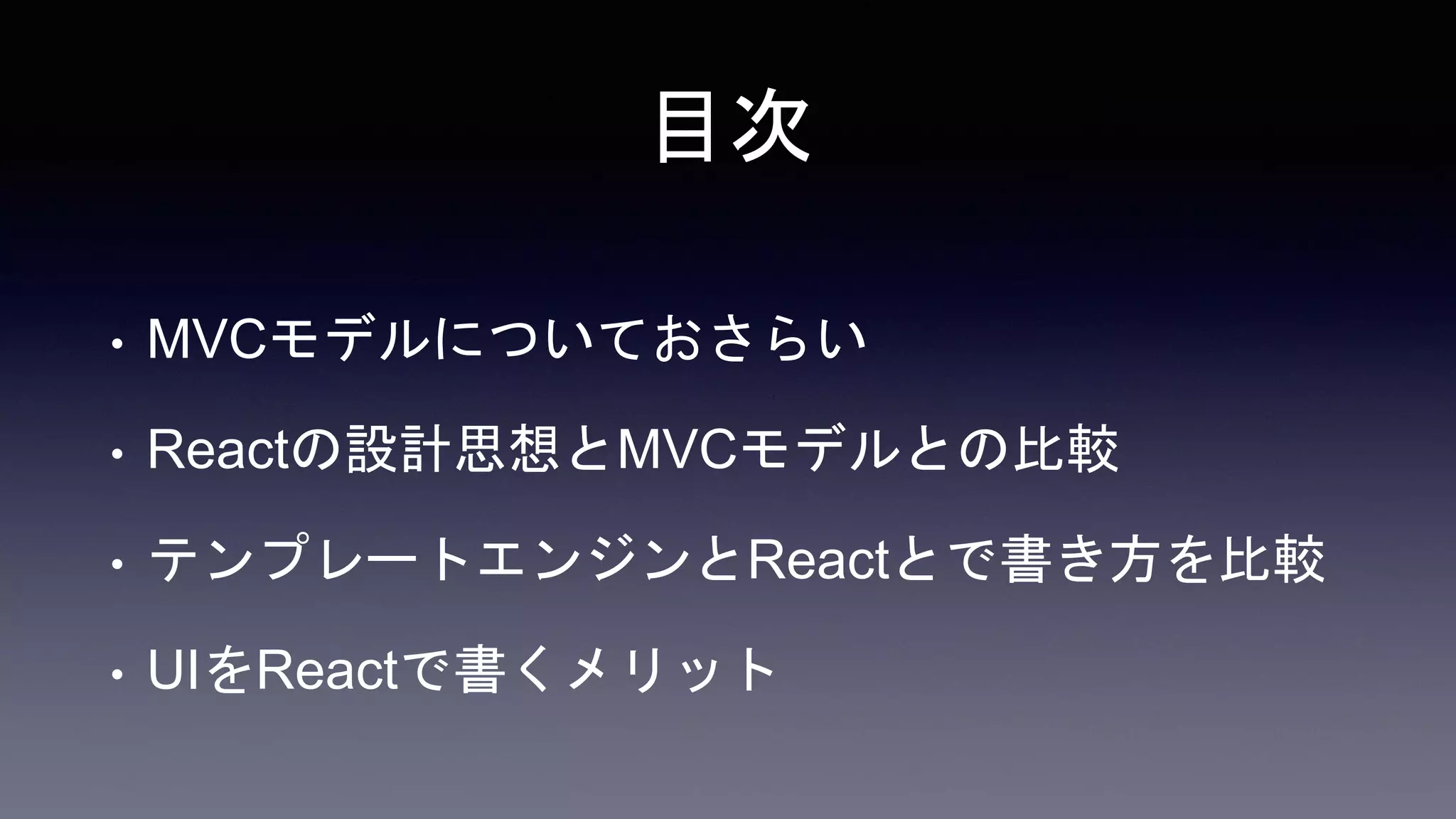 目次 • MVCモデルについておさらい • Reactの設計思想とMVCモデルとの比較 •