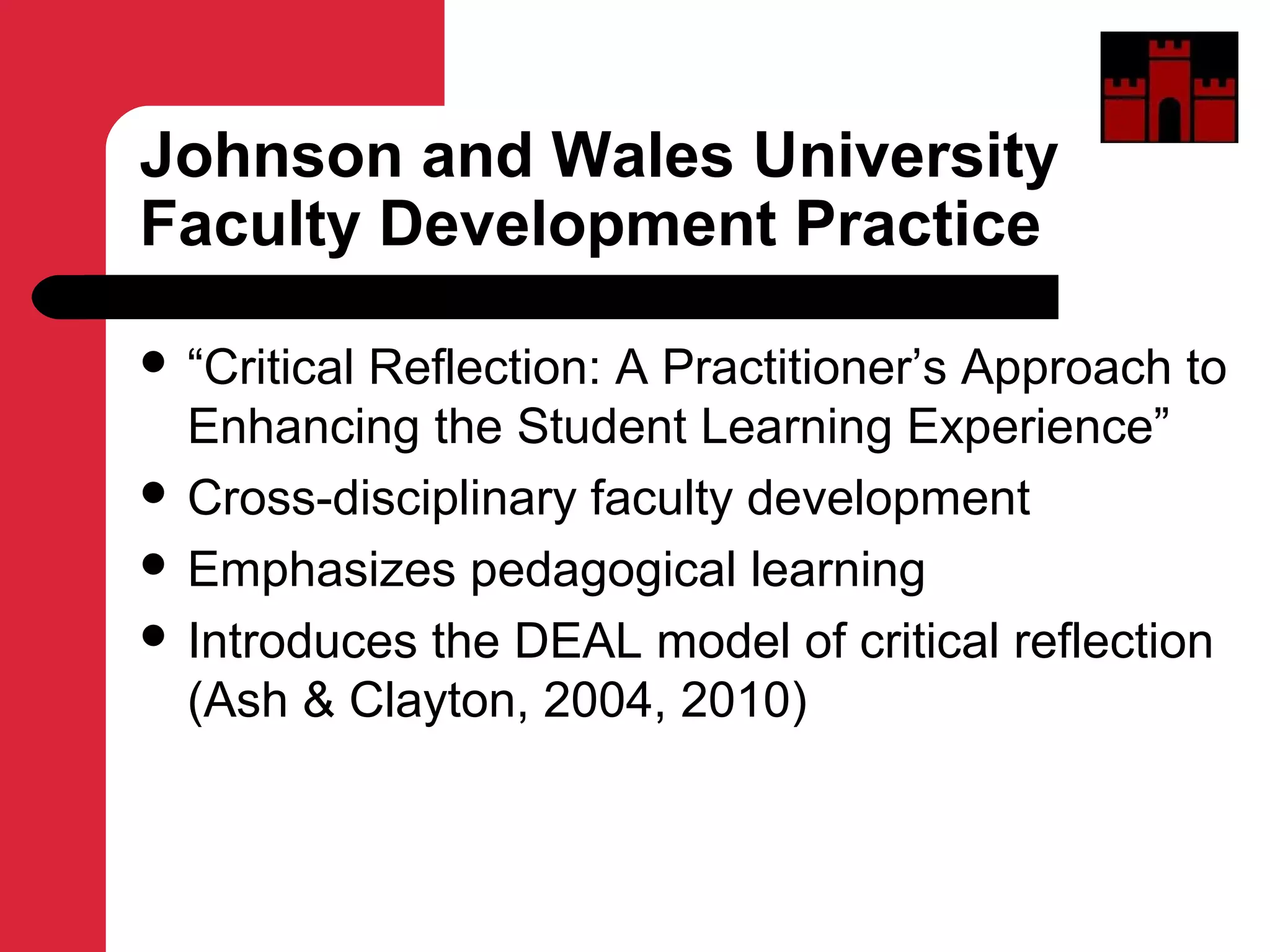 The document evaluates faculty development practices at Johnson and Wales University. It discusses how JWU emphasizes cross-disciplinary faculty development and pedagogical learning through introducing the DEAL model of critical reflection. The DEAL model provides a framework for faculty to objectively describe experiences, examine them using learning goals, and articulate what was learned. The effectiveness of these practices is seen in the development of trust and learning community among faculty through open discussion.