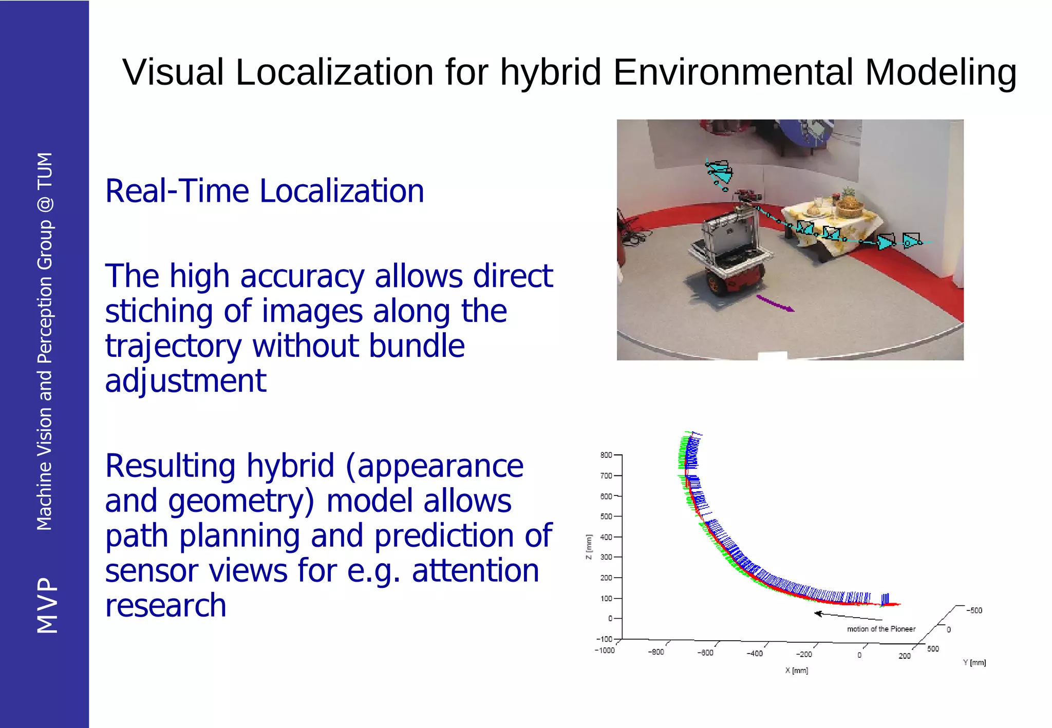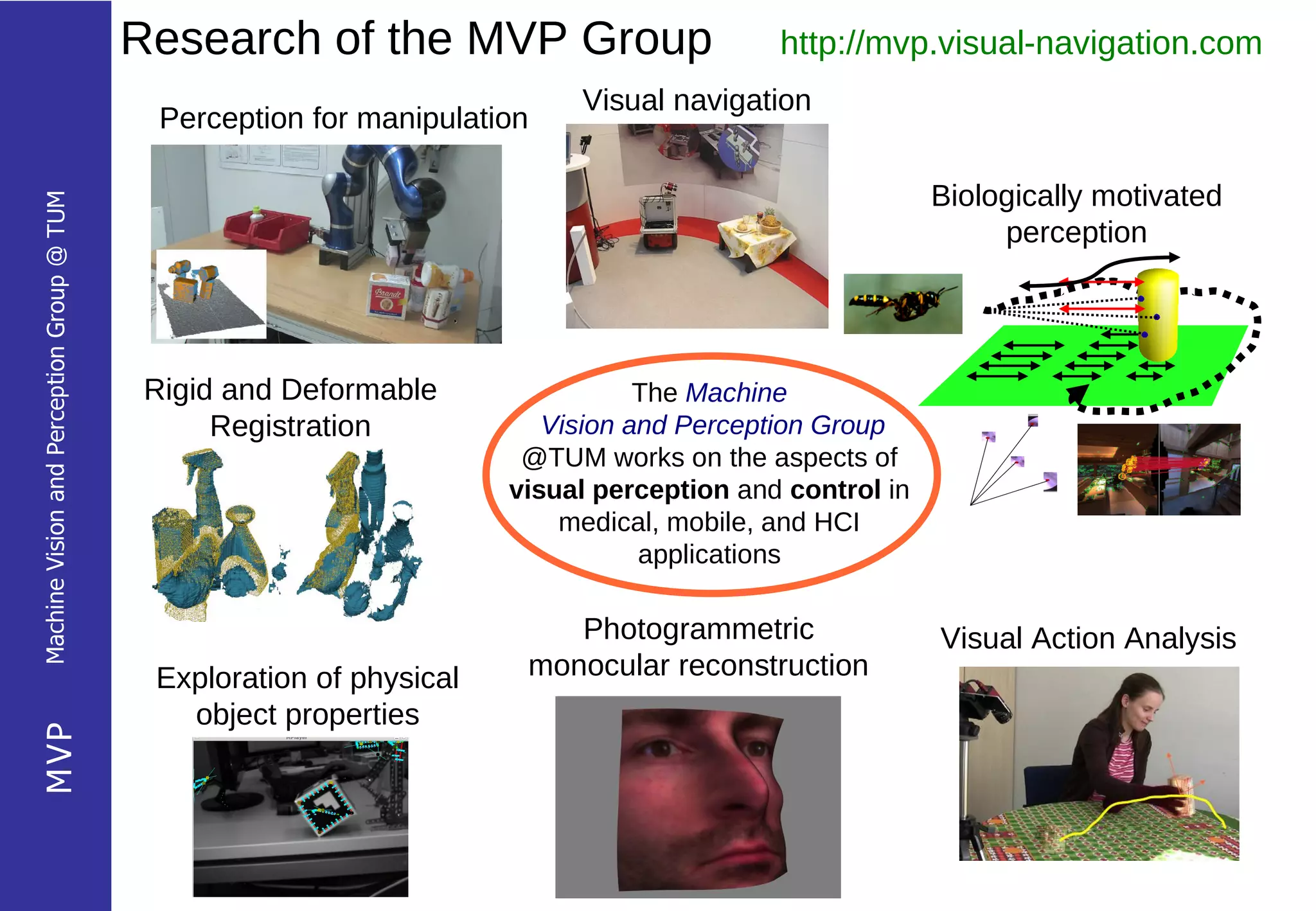 The Machine Vision and Perception Group at the Technical University of Munich conducts research on visual perception and its application to medical, mobile, and human-computer interaction systems. This includes areas like registration of rigid and deformable objects, monocular reconstruction, visual localization and mapping, and biologically inspired navigation and action analysis. The group develops algorithms for tasks like 3D object recognition in point clouds that are robust to incomplete and noisy data.