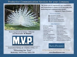 The document summarizes the services provided by MVP Marketing, LLC, a marketing firm led by Michael W. Player. MVP helps companies with advertising, marketing, public relations strategies and tactics to effectively communicate with targeted audiences. Client testimonials praise MVP's creative solutions and ability to increase sales. The firm offers services like marketing plans, branding, media placement, and graphic design to help companies successfully market their products and services.