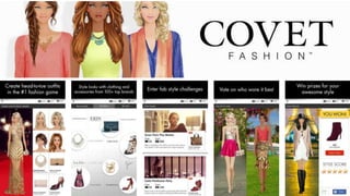 The document outlines the iterative design process for a mobile fashion game called Covet Fashion. It includes customer insights from interviews, an MVP canvas showing the initial target market, unmet customer needs, and assumptions. The design was updated based on further research findings. Key screens and flows were sketched out, including onboarding, gameplay loops, and social features. A product brief was drafted to summarize the vision for the game - allowing players to build their dream closet by collecting designer clothes and creating outfits to gain prizes and status.