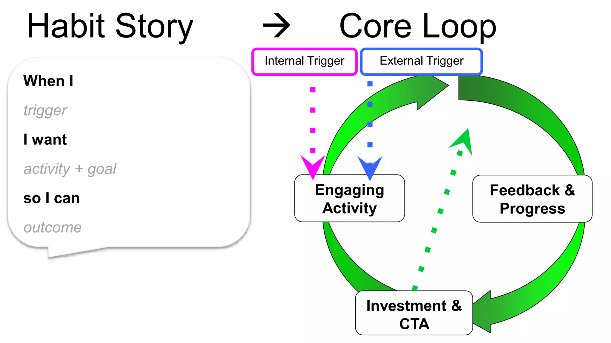 The document discusses the key elements of an effective core loop for building habits, which include internal and external triggers, an engaging activity with a goal, feedback and progress updates, and driving continued investment and re-engagement through customization and other triggers. It provides a checklist for prioritizing habit-building stories and designing core loops that incorporate these critical components.