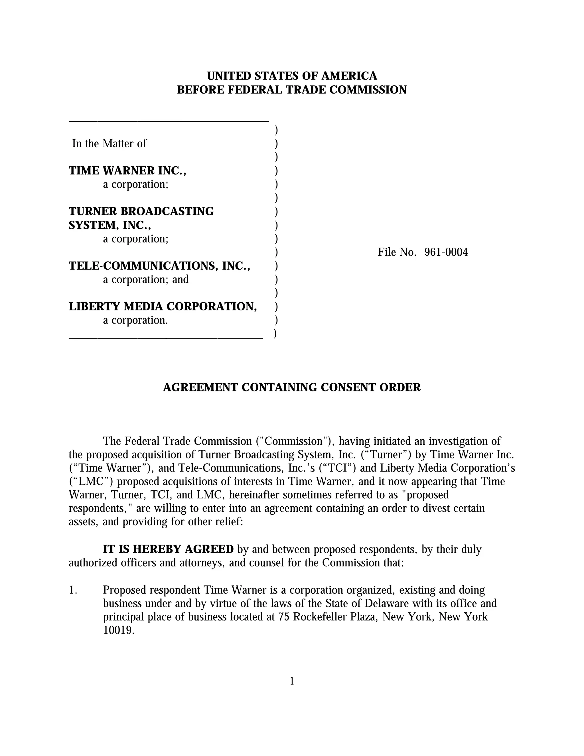 The Federal Trade Commission is investigating the proposed acquisition of Turner Broadcasting System by Time Warner, along with acquisitions involving Telecommunications, Inc. and Liberty Media Corporation, who are willing to enter an agreement that includes asset divestiture and other relief measures. The agreement contemplates compliance reporting by the respondents, and allows for public comment and potential acceptance by the Commission, following which a complaint may be issued. The document outlines the terms of the agreement, the roles of involved parties, and the obligations related to the acquisitions.
