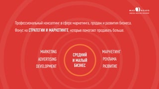 Документ описывает услуги консалтинговой компании в сфере маркетинга и продаж, акцентируя внимание на стратегиях для увеличения клиентской базы и повышения уровня сервиса. Он включает рекомендации по проведению собеседований для найма персонала, мотивированию сотрудников и сбора обратной связи от клиентов. Также раскрываются методы работы с проблемными клиентами и ключевые аспекты маркетинговой стратегии для бизнеса.