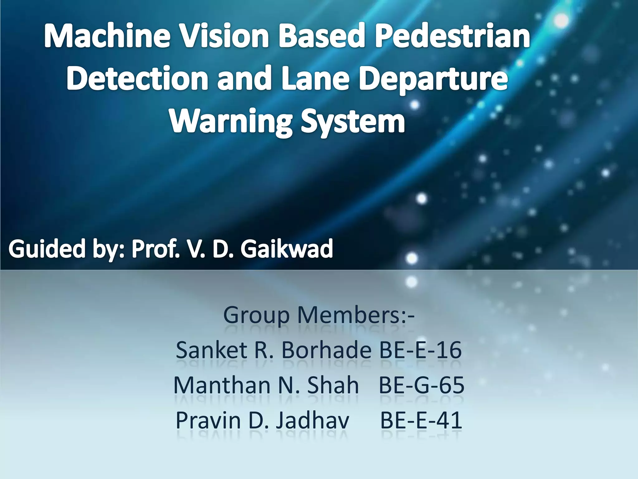 This document describes a project to develop a pedestrian detection system and lane detection and warning system for medium-class cars. It is created by group members Sanket R. Borhade, Manthan N. Shah, and Pravin D. Jadhav.