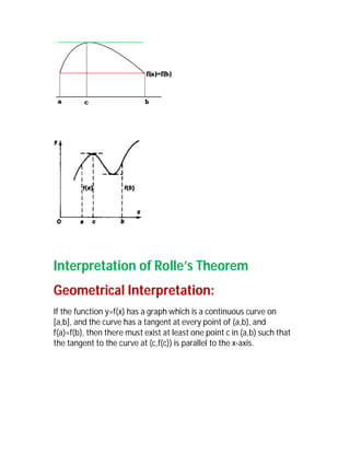 Rolle's theorem states that if a function is continuous on a closed interval and differentiable on the open interval with equal values at the endpoints, then the derivative is 0 for at least one value in the interval. The mean value theorems - Lagrange's and Cauchy's - generalize this idea, relating the average rate of change over an interval to the instantaneous rate at a point within the interval. Examples are provided to illustrate the theorems and exceptions that can occur when their conditions are not fully met.