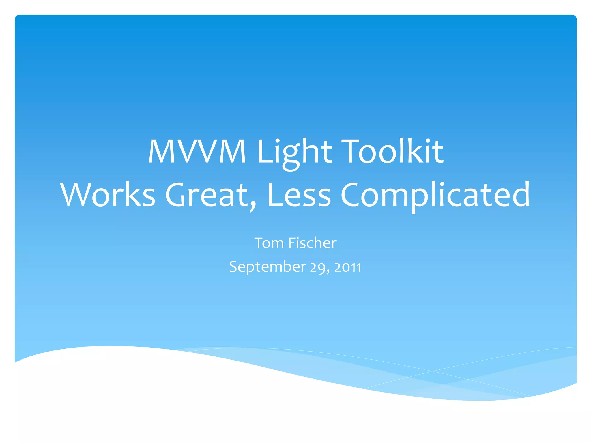 The document discusses the MVVM Light toolkit, describing it as a lightweight toolkit that supports the MVVM pattern for WPF and Silverlight applications. It provides an overview of the toolkit, demonstrates its use in a sample application, and compares it to other MVVM toolkits like Prism and Caliburn Micro. The demonstration shows how MVVM Light addresses issues that came up when applying MVVM to the sample application without a toolkit.