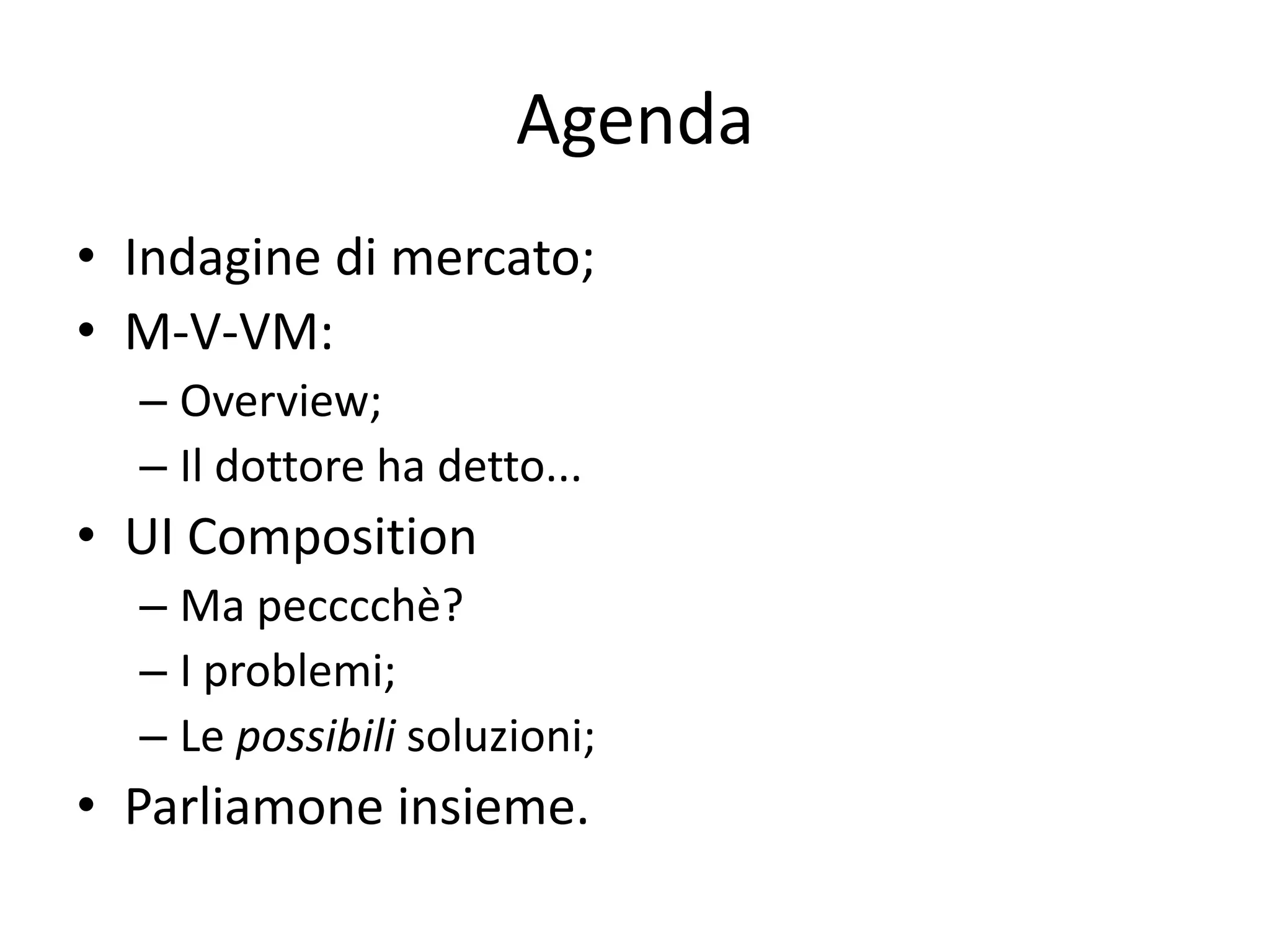 Il documento discute i problemi e le soluzioni relativi alla composizione dell'interfaccia utente (UI) utilizzando il pattern M-V-V-M. Viene analizzata l'importanza dell'iniezione delle dipendenze e la modularità nel processo di sviluppo, evidenziando sia i pro che i contro di tali approcci. La presentazione invita a una discussione interattiva sugli argomenti trattati, sottolineando il valore pratico nel fornire soluzioni e migliorare la gestione dei progetti software.