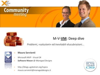 Il documento discute della produttività e dell'importanza del modello MVVM, evidenziando concetti come l'inversion of control e l'unit testing. Viene sottolineato che la performance dipende dai punti di vista e che è meglio non affrontare problemi non ancora manifesti. Infine, il focus è sull'esperienza di design time e sul ruolo centrale del VM, chiarendo che non si tratta di una macchina virtuale.