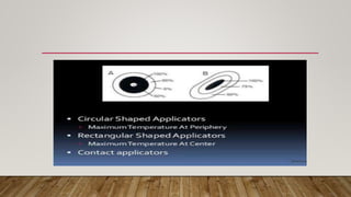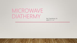 Microwaves are electromagnetic waves with a frequency between 300 MHz and 300 GHz that can be used for diathermy therapy. Microwaves are produced using a power supply, magnetron, and emitter/antenna. They are absorbed more by tissues with high water content like muscle and heat the surface more than deeper tissues. Microwaves can be used to treat pain, inflammation and other conditions by increasing blood flow and metabolism through localized heating, but risks include burns if moisture is present or the eyes/testes are exposed directly to the beams. Proper positioning and monitoring of the patient is needed during treatment.