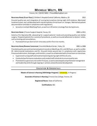 Michelle Welty is a registered nurse with over 15 years of experience in clinical, infusion, and hospital settings. She has a comprehensive understanding of best practices and regulatory compliance. Welty is currently working as a staff nurse at the Fresno County Jail and as an in-home infusion nurse. She also has experience as a clinical nursing instructor and has held various nursing roles, including float pool nurse and nursing supervisor. Welty is committed to continued professional development and obtaining her Master's degree.