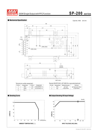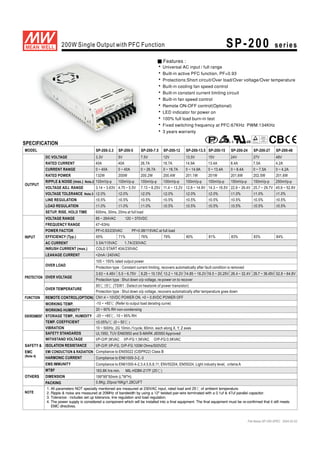 This document provides specifications for a 200W single output power supply series with PFC function. Key features include universal AC input, built-in active PFC, overcurrent, overvoltage and overtemperature protections, and 100% full load burn-in testing. It lists specifications for 9 models varying in output voltage from 3.3V to 48V, including electrical performance parameters, protections, functions, environmental limits, safety standards, and mechanical dimensions.