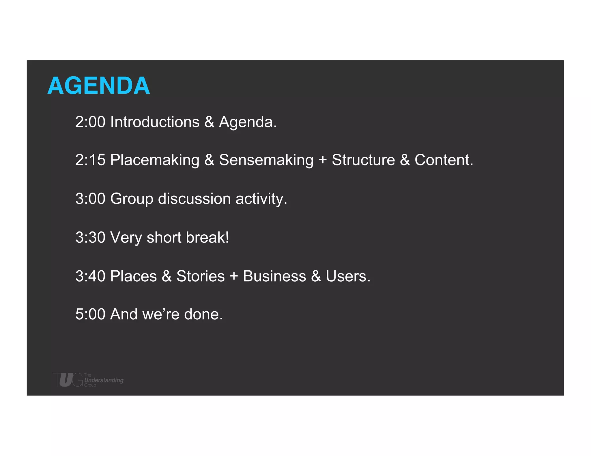 The document outlines a presentation on placemaking and sensemaking, detailing the processes by which spaces become meaningful places and how narratives influence user experiences. It discusses the importance of information architecture in structuring environments and the role of content in fulfilling architectural promises. There are also group discussions aimed at exploring the relationship between structure, content, and user experience in the context of digital and physical spaces.