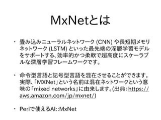 や長短期メモリ ネットワーク (LSTM) といった最先端の深層学習モデル をサポートする、効率的かつ柔軟で超高度にスケーラブ ルな深層学習フレームワークです。 • 命令型言語と記号型言語を混在させることができます。 実際、「MXNet」という名前は混在ネットワークという意 味の「mixed networks」に由来します。(出典:https:// aws.amazon.com/jp/mxnet/) • Perlで使えるAI::MxNet