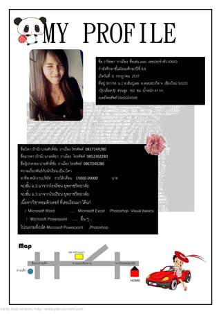 This document appears to be a profile containing personal details such as name, age, address, phone numbers, skills and interests. It lists the individual's name, age, address, phone numbers and salary expectations. It also outlines skills in Microsoft Office programs, Photoshop and Visual Basics as well as interests in photography and traveling.