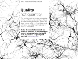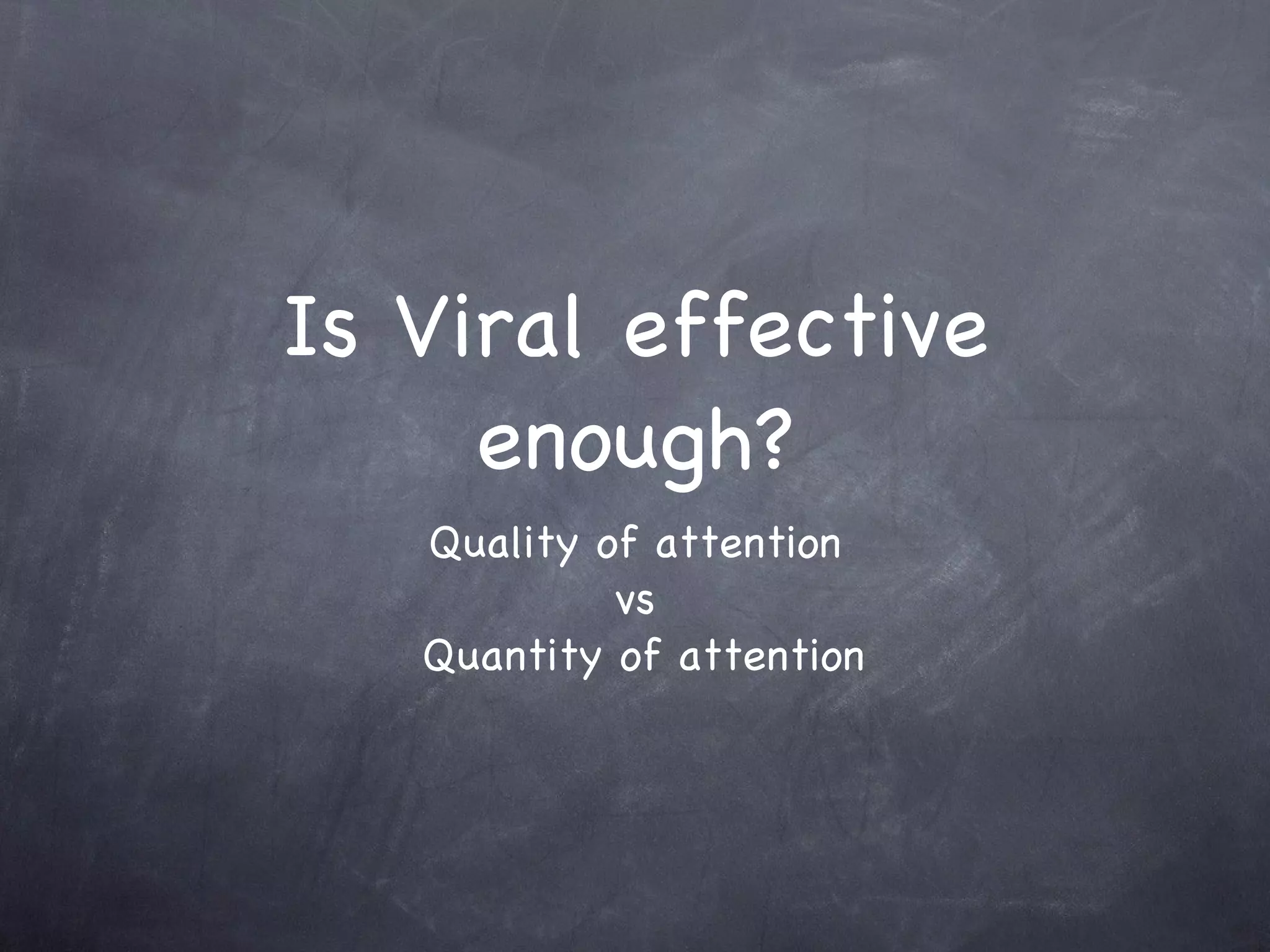 This document discusses the difference between the quantity of views a viral video receives versus the quality of attention and impact on viewers' behaviors. While some top YouTube videos may gain hundreds of thousands of views, the real question is how effectively the message convinces people to change behaviors, not just how many people see or hear the message in passing.