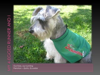 Perroton is a unique dog racing event held in Quito, Ecuador where competitors run short distances with their dogs. Dogs are categorized by weight and runners and dogs run different routes depending on their category. The race aims to provide moments of glory for runners and their pets and has encouraged many people to start running and caring for their dogs. Some advice for runners includes waiting until dogs are 8 months old to run, warming up with walks, paying attention to signs of fatigue, staying hydrated, and being aware of pad injuries on hard surfaces.