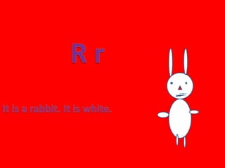 The document describes various objects where each line begins with a letter of the alphabet. It states what the object is such as an apple, ball, car, dog, etc. and provides the color of each object.
