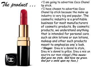 The document proposes an advertising campaign for Coco Chanel lipstick. It aims to target wealthy and middle-class women who want to feel glamorous and confident without needing approval from others. The ad will emphasize the lipstick's quality, glamour, and ability to make one feel stylish and graceful. It will use beautiful models and repetition of slogans and images to create desirability and credibility. The ad will highlight the lipstick's moisturizing qualities and wide range of shades to suit different looks.