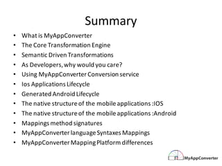 MyAppConverter is a service that enables seamless native code conversion from iOS to Android without the need for an SDK or runtime, providing developers with fully documented and scalable code. The transformation engine facilitates semantic-driven conversions while adhering to the native structures and lifecycle of both platforms. It simplifies language syntax mappings and addresses platform-specific differences, ensuring an optimal development experience across mobile platforms.