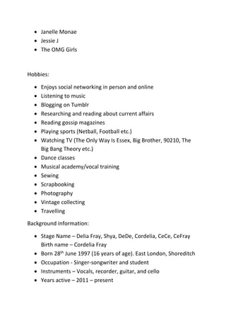 This document profiles an artist named Cordelia Fray, or Delia Fray. It describes her as humble, cool, quirky, and passionate. Similar artists mentioned include Ella Eyre, Emeli Sande, and Janelle Monae. The profile outlines Cordelia's background growing up in East London with a family of musicians and her education at The Brit School. It provides details of her early career participating in Britain's Got Talent and currently working on her debut album while also pursuing modeling.