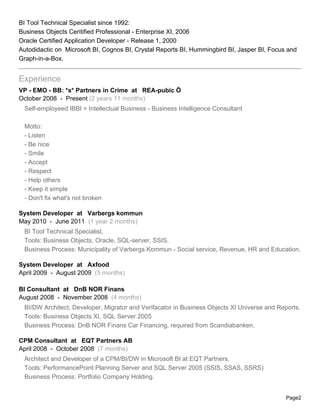 This document provides a summary of an individual's qualifications and experiences in business intelligence. The individual has over 25 years of experience in roles involving developing BI tools, dashboards, and reports for various companies in industries such as healthcare, finance, telecom, and retail. They are skilled in tools from Microsoft, Oracle, SAP, and others. The individual's goal is to combine their interests in art, design, technology and finance to think creatively and solve problems.