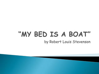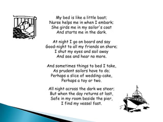 The poem describes a child's bedtime routine and journey to sleep. It is told in four stanzas with an AABB rhyme scheme. Each stanza has four lines. The child gets ready for bed with help from their nurse, saying goodnight to friends before embarking on an imaginary sea voyage while in bed. Though they sail away into darkness, the child awakens safely back in their bedroom each morning.