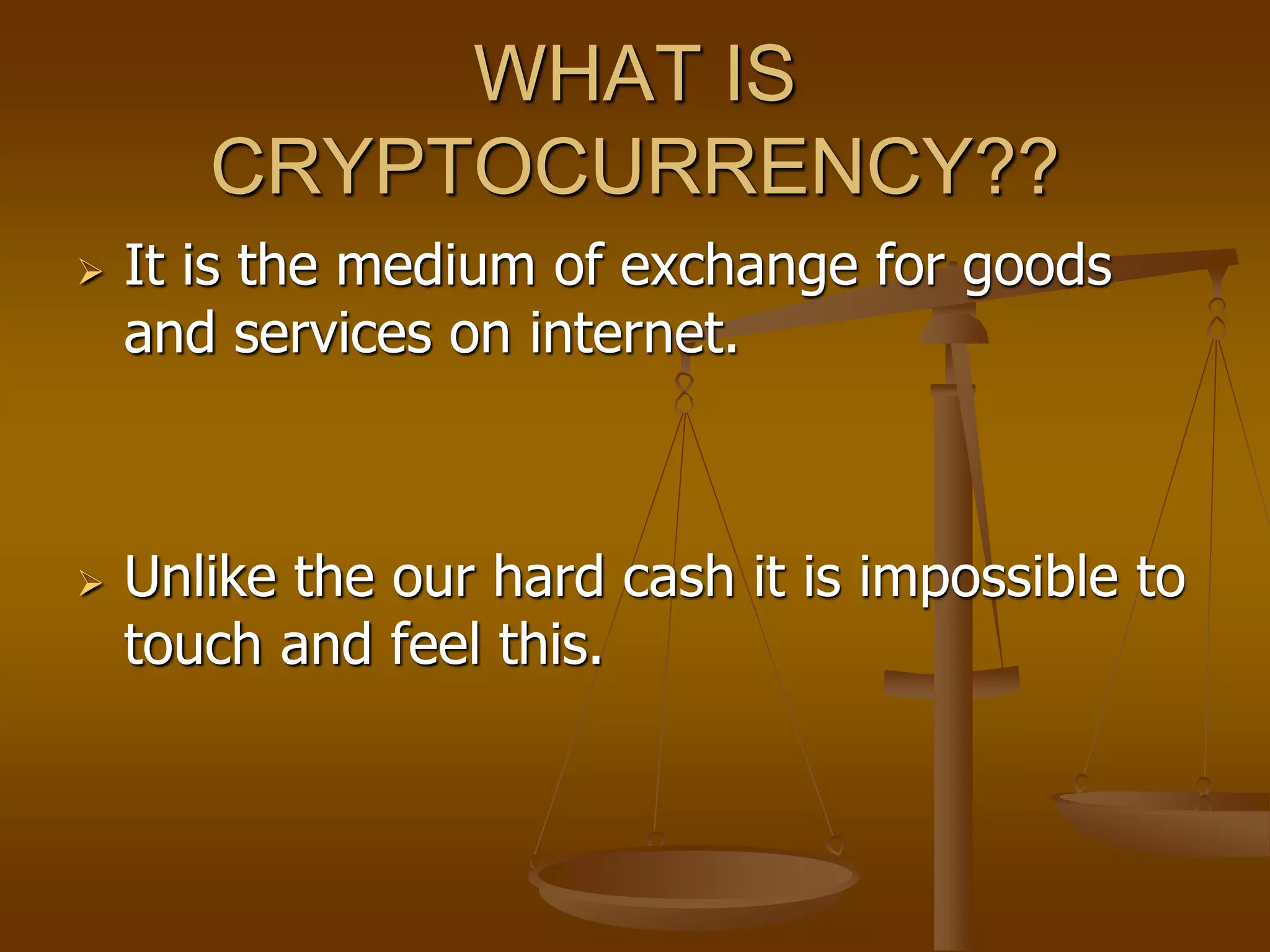 This document provides an overview of cryptocurrencies like Bitcoin. It explains that cryptocurrencies are digital currencies that use decentralized systems instead of central banks. Bitcoin was invented in 2009 by Satoshi Nakamoto and was the first cryptocurrency. It operates using a peer-to-peer network and encryption techniques to generate and verify transactions. While it provides benefits like security, acceptance by merchants, and avoidance of taxes, cryptocurrencies also face issues like volatility in value, risks of hacking, lack of regulation, and potential use for illegal activities. The future of cryptocurrencies like Bitcoin is uncertain and will depend on how governments and financial institutions respond to their growth.