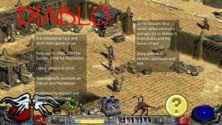 The document provides an overview of several popular video game series developed by Blizzard, including Diablo, Warcraft, and StarCraft. Each series has its own unique storyline and gameplay style, ranging from role-playing and hack-and-slash to real-time strategy. The document also includes a quiz related to the content of these games.