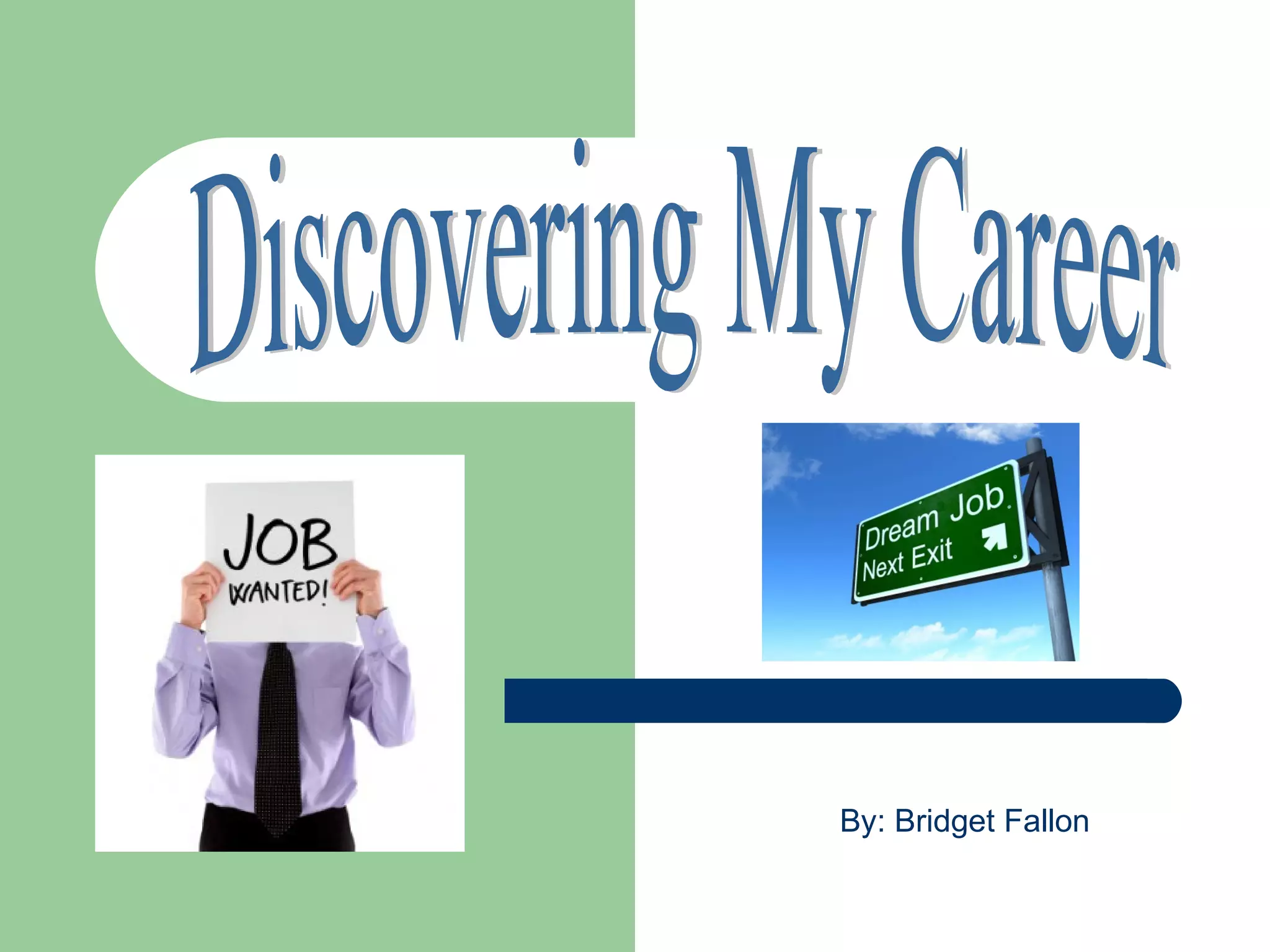 The document discusses Bridget Fallon's personality traits, skills, goals, values, and career interests. She describes herself as lively, creative, independent, and good at writing, art, and problem solving. Her goals include high grades, internships, exercise, college, travel, and advanced degrees. She is interested in careers like translation, writing, teaching, and photography that match her personality.