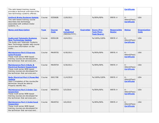This document contains a record of training courses completed by an individual. It lists the course name, code, date completed, scores (if available), responsible dealer, and status for each course. The courses cover a wide range of technical automotive topics for systems like engines, transmissions, brakes, electrical systems, and more. The document also includes the individual's organization code and indicates that all courses were attended and passed.