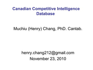 The document discusses the importance of innovation and intellectual property rights (IPR) as key components of competitive advantage in business. It highlights risks associated with competition, offers insights on Canadian market players, and emphasizes the use of patent mapping for strategic planning. The author also provides a summary of Canadian patent statistics and the significance of synchronized data with the USPTO for competitive intelligence.