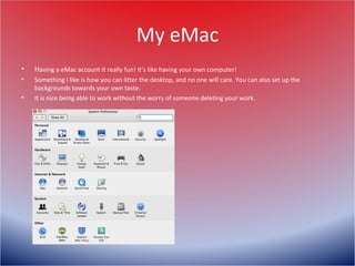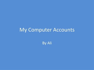 Ali discusses several computer accounts they have access to including an eMac account which allows customizing the desktop without worry of deletion, an iGoogle account which provides customizable widgets and daily information, a Blogger account which functions like an online diary to share with friends, a Wikispaces account for their grade 6 class which includes a profile page but warns against sharing personal details publicly, and a FirstClass account similar to school email but with additional features like calendar, storage, and messaging.