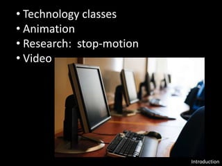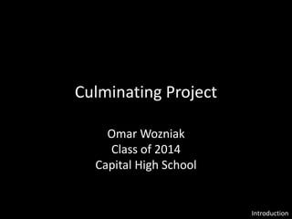 This document summarizes Omar Wozniak's culminating project for his 2014 graduation from Capital High School. It outlines his research process for creating a 5-minute stop-motion animation video, including researching stop-motion techniques, obtaining supplies, storyboarding, filming, editing, and adding audio. It documents the steps he took and lessons learned, and considers future applications of his technical skills in animation career.