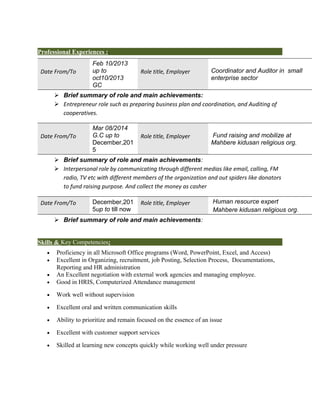 The document is a curriculum vitae for Melaku Sebsbie Mamo that outlines his personal details, education history, professional experience, skills, duties and responsibilities. It details that he has a BA in Management from Debreberhan University, has worked in roles related to entrepreneurship coordination and auditing, fundraising and human resources. His current role involves human resources expertise at a religious organization, where his responsibilities include recruitment, employee administration and labor relations.