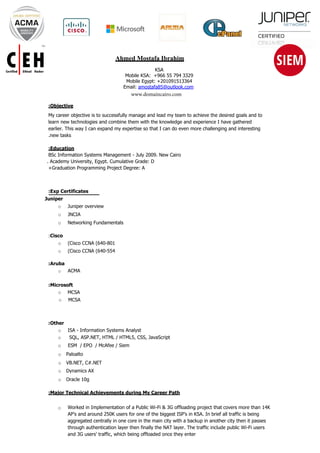 Ahmed Mostafa Ibrahim is a systems analyst and technical manager based in KSA with over 10 years of experience managing IT projects. He has managed teams implementing public WiFi networks and 3G offloading projects covering over 14k access points. His technical skills include Aruba, Cisco, Juniper, Microsoft, and he has certifications in JNCIA, CCNA, ACMA, MCSA. He aims to take on more challenging tasks by continuously learning new technologies.
