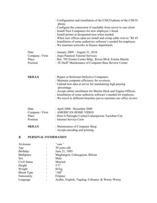 Samuel Mendoza is applying for a position and provides his resume. He has over 10 years of experience in IT and accounting roles in Saudi Arabia and the Philippines. His experience includes computer repair, network administration, accounting tasks like reconciliations, and customer service. He is proficient in Arabic, English, Tagalog, Cebuano, and Waray-Waray. He has a Bachelor's degree in Computer Science and has attended training in computer operations and programming.