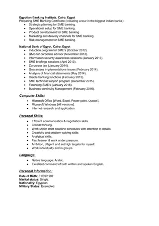 Ismaeel Saad Imam is a credit analyst with experience in financial analysis and customer service roles, seeking a challenging position in a multinational organization. He holds a CFA Level 1 certification and has a degree in accounting from Benha University, with notable work experience at the National Bank of Egypt and Barclays Bank. His skills include communication, critical thinking, and proficiency in Microsoft Office applications, alongside being fluent in Arabic and English.