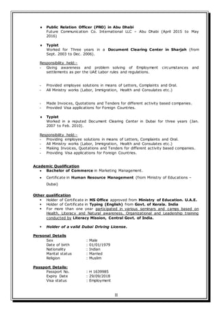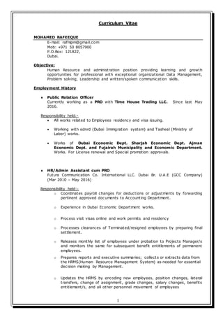 Mohamed Rafeeque is seeking a human resources or administration position. He has over 6 years of experience in human resources and public relations roles. His responsibilities have included managing employee visas and residencies, payroll, and coordinating with various Dubai departments. He holds a Bachelor's degree in Marketing Management and certificates in human resources management, computer skills, and typing.