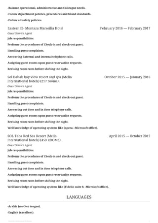 This document is a resume for Mustafa Mahmoud Mubarak. It summarizes his education and work experience in hotel management and front office roles over the past 7 years, including his current role as Front Office Shift Leader at Eastern El- Montaza Marseilia Hotel since 2017. It also lists his proficiency in languages, hotel systems, software, and professional courses completed.