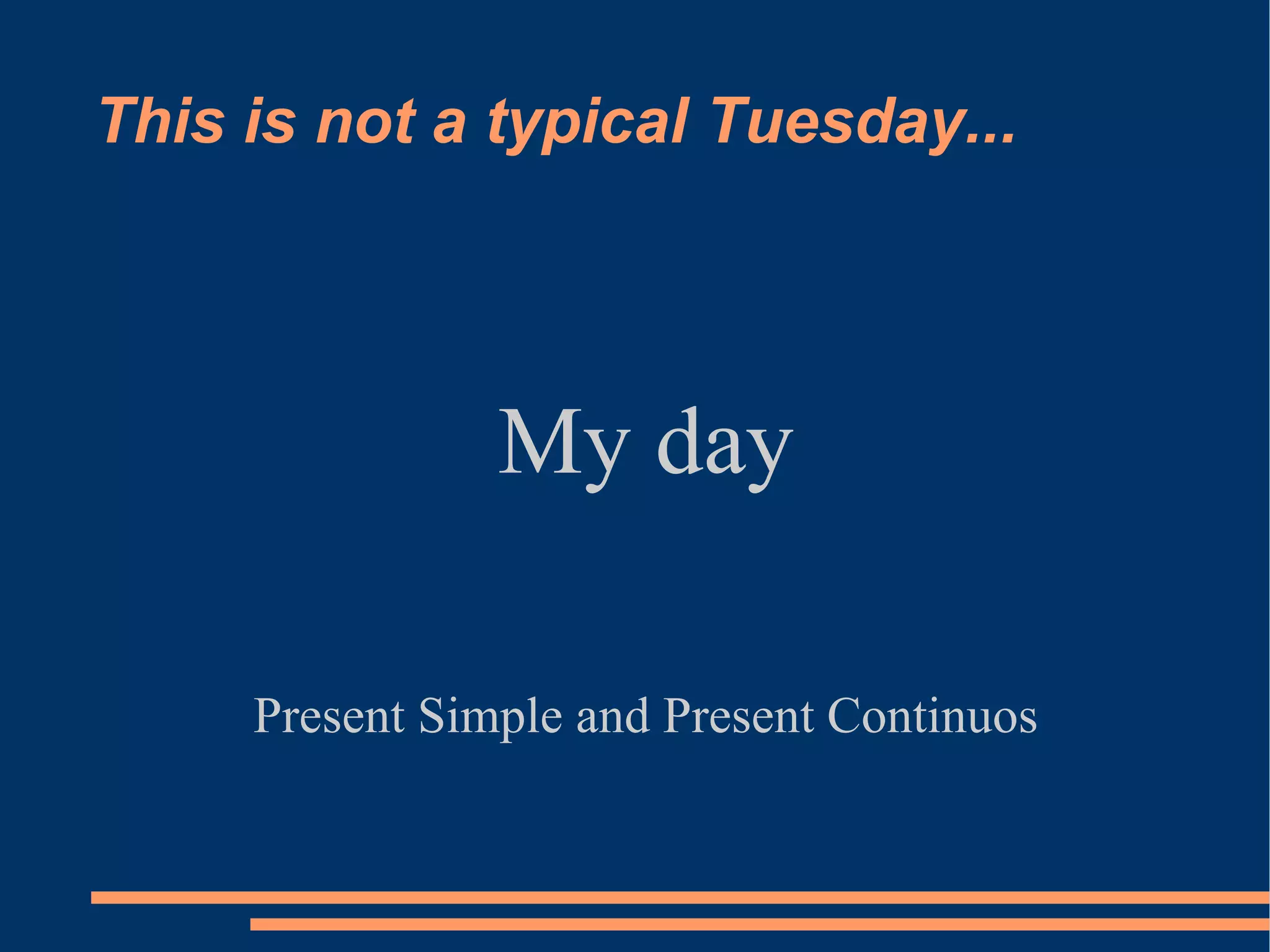 This document describes how the narrator's typical daily routine is different on this particular Tuesday. Instead of their usual schedule of getting up at 9am, having milk and biscuits for breakfast, going to school on foot, and watching Friends in the evening, they are getting up earlier, having different foods for meals, taking the bus to school, going to the park after school instead of home, and watching a game show instead of the news. They are also going to bed earlier than usual.