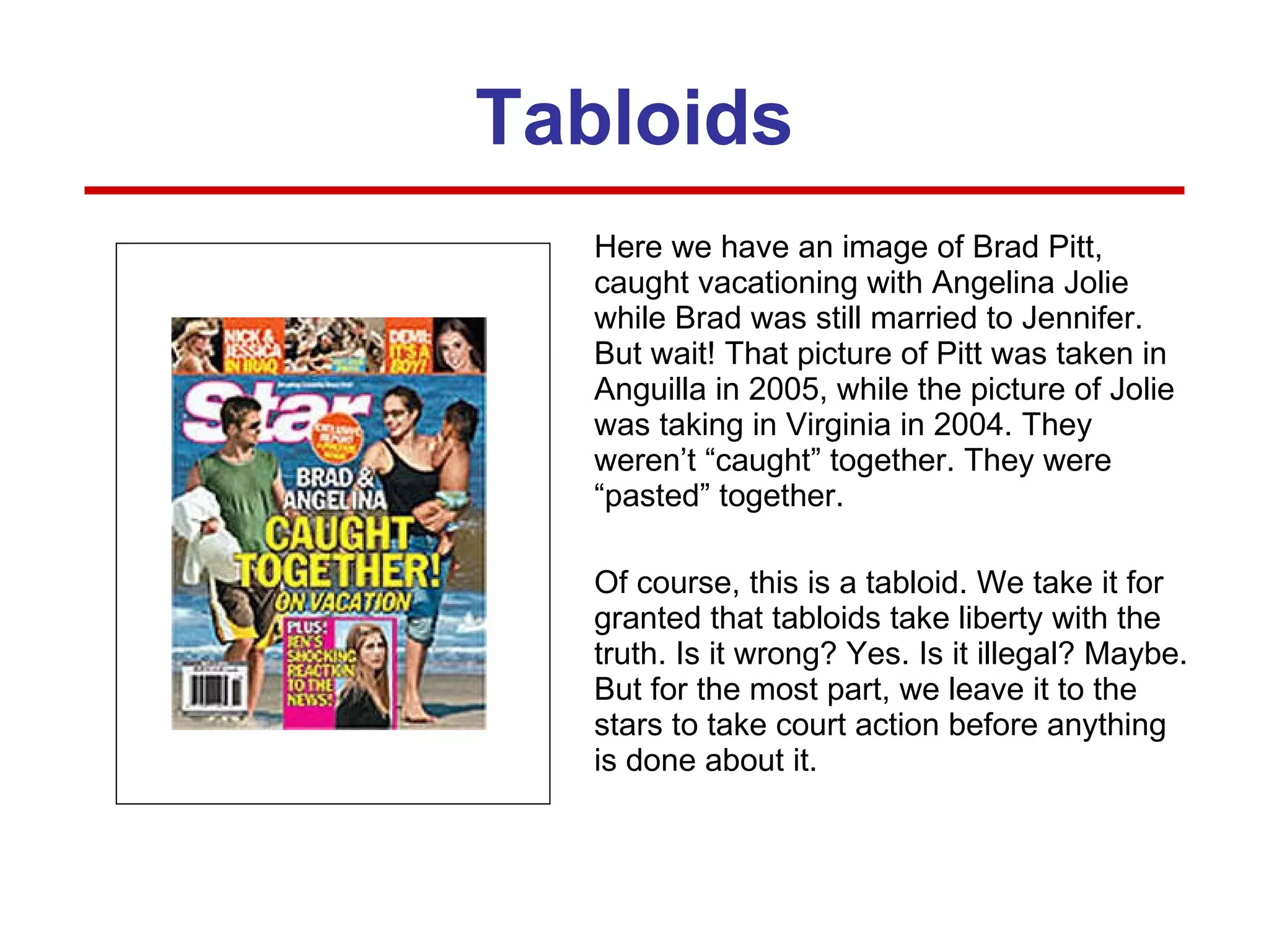 The document discusses various examples of photo manipulation by media sources and raises ethical questions about manipulating images and potentially influencing public opinion. It explores situations where photos were digitally altered by pasting together images from different times or placing people's faces on other bodies. While some manipulations are done in fun, others present fabricated information or aim to subtly alter perceptions, requiring consideration of expectations for truthfulness and disclosure of edits depending on the source and purpose.