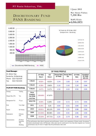 This document is a fund report from PT Panin Sekuritas Tbk that provides information on the Discretionary PANS Bandung fund as of June 1, 2012. The key details include: