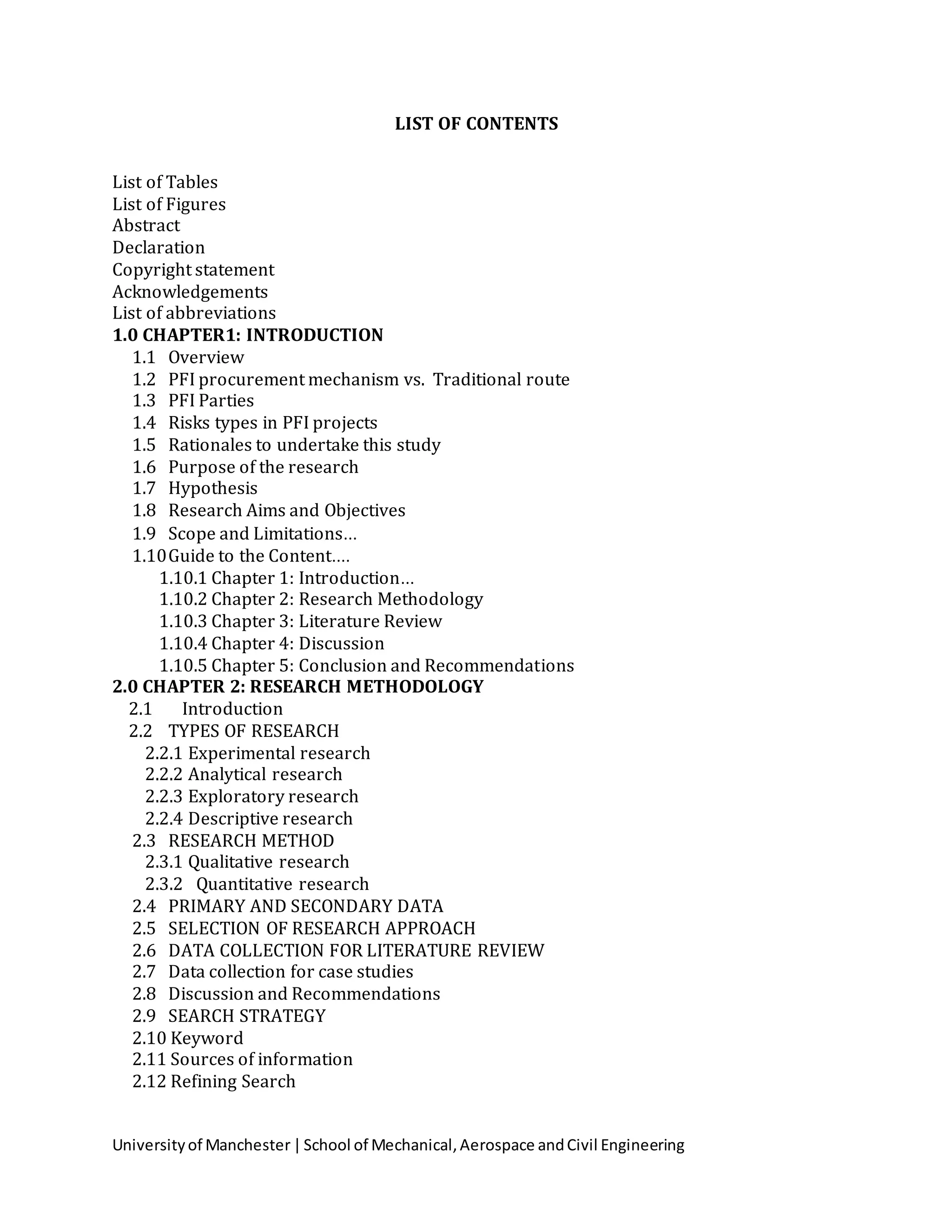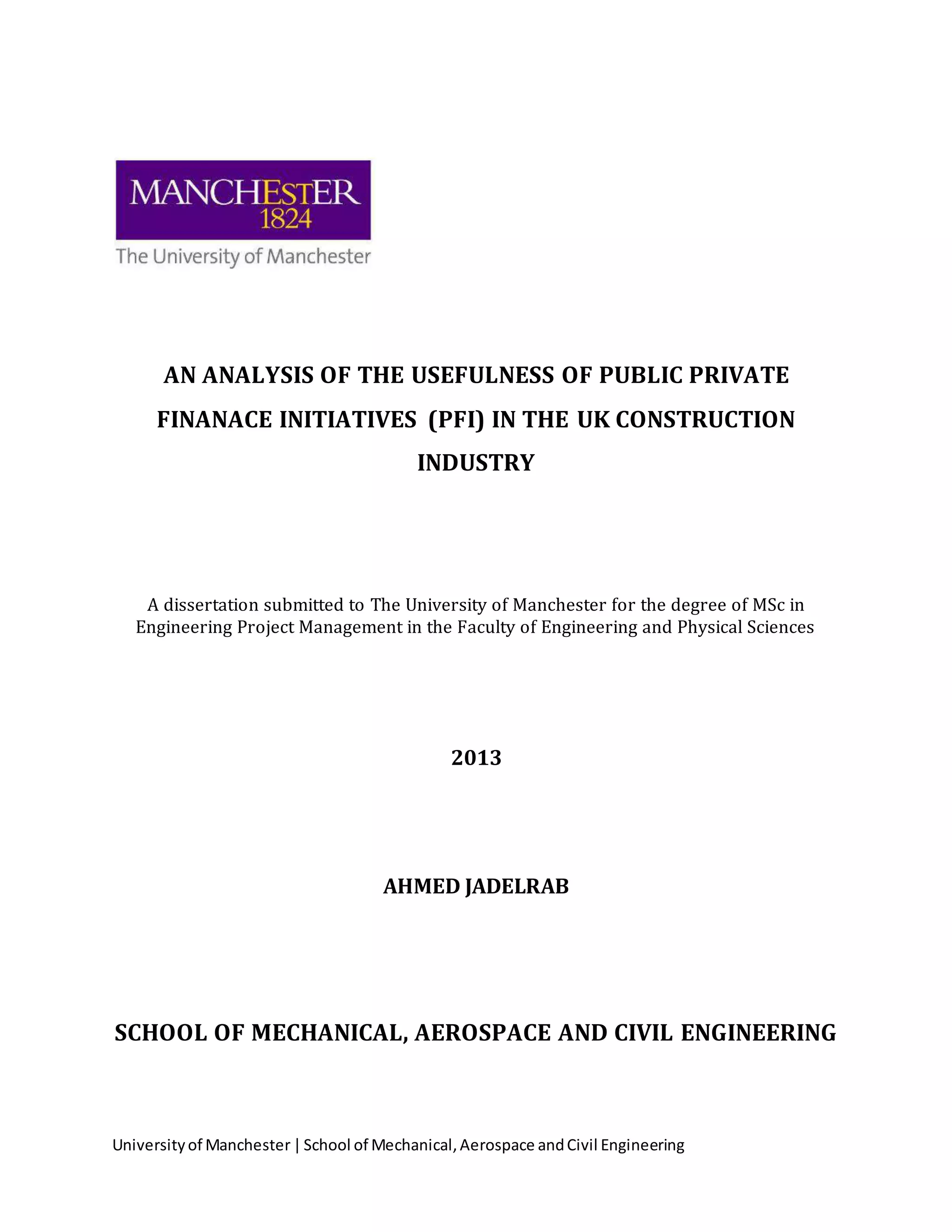 This document provides an overview of Public Private Finance Initiatives (PFI) in the UK construction industry. It discusses the history and development of PFI, comparing it to traditional procurement methods. Key aspects covered include the different parties involved in PFI (special purpose vehicle, third-party funders, awarding authority), the bidding and operational process, and types of risks associated with PFI projects. The document aims to examine whether PFI can offer value for money to the public sector through an analysis of literature on PFI's advantages and disadvantages.