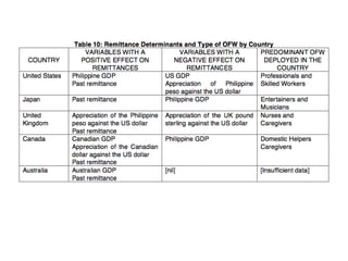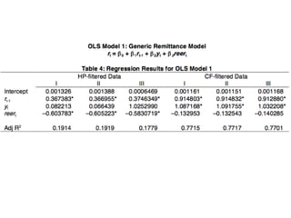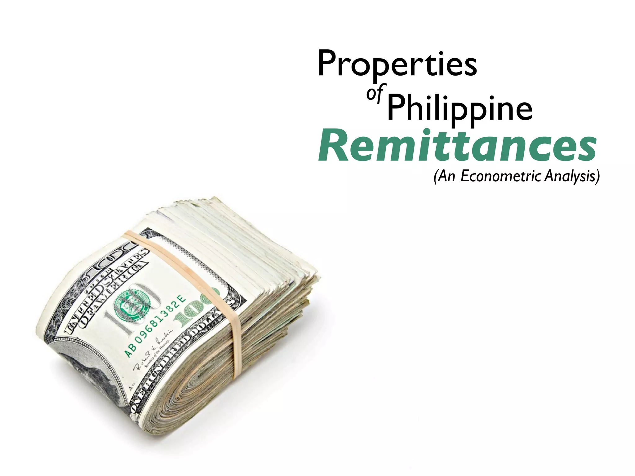This dissertation proposal explores the properties of Philippine remittances, particularly their cyclical nature and macroeconomic impacts. It involves detailed data treatment and analysis techniques to understand the dynamics of remittances from overseas Filipino workers. The research aims to apply new methodologies to remittance data, addressing issues like exchange rate effects and structural breaks in the data.