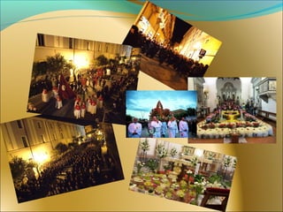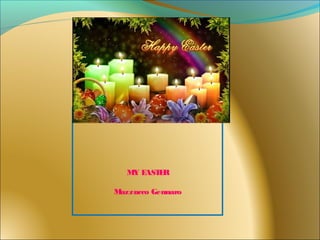This document describes Easter traditions in the author's hometown of Campobasso, Italy. It details the religious ceremonies and traditions associated with Palm Sunday, Holy Thursday, Good Friday, Holy Saturday and Easter Sunday. These include blessing palm branches, washing feet, processions, baptisms and Easter mass. Secular traditions such as eating boiled eggs, salami, pizza and Easter cake are also described. The author contrasts older traditions, like their grandparents preparing large family meals, with modern traditions of giving chocolate Easter eggs.