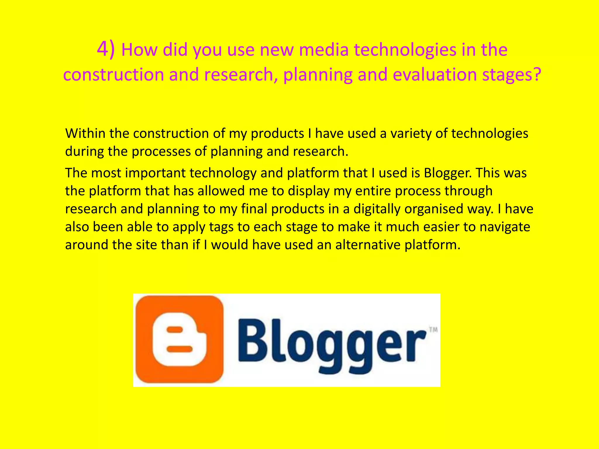 The student used various new media technologies throughout the construction, research, planning, and evaluation stages of their project. Blogger was the main platform used to organize and display the entire process. Google Docs was utilized to create a questionnaire for research. Flickr and SlideShare facilitated visual analysis of existing materials to aid research. YouTube allowed for feedback on draft trailers. Padlet displayed final ancillary products for evaluation. Prezi was employed to present the evaluation, though it had some accessibility issues. Overall, the new media technologies helped manage, display, and collate feedback for the various stages of the project.