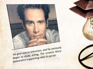 Jim Carrey is the author's favorite actor. Carrey was born in 1962 in Canada to a poor family with financial difficulties. He struggled in school as a child and preferred making faces to studying. Carrey began performing comedy sketches in small clubs at age 16 but was not initially successful. His career turned around in 1994 with breakout roles in Ace Ventura: Pet Detective and The Mask, which made him famous worldwide. Carrey has won Golden Globes but his later films were less successful with audiences. Now he remains a beloved actor known for his brightness and positivity.
