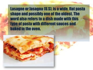 Lasagne is a type of flat pasta that is commonly baked in layers with sauces and other ingredients. There are different theories about the origins of lasagne, including that it comes from an ancient Greek dish called "laganon" which was a flat sheet of pasta dough cut into strips. A traditional lasagne recipe involves layering a meat sauce, lasagne noodles, and a béchamel sauce mixture in a baking dish and baking for about 45 minutes. There are many varieties of lasagna such as chicken lasagna, ricotta lasagna, vegetarian lasagna, and Mexican lasagna.