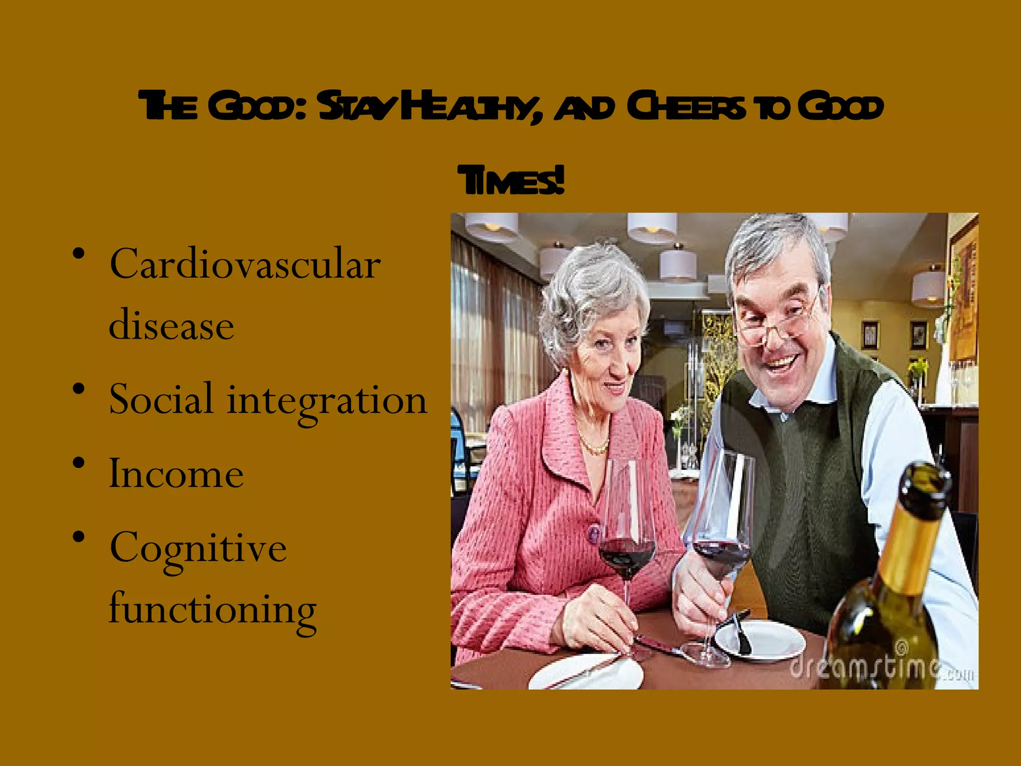 This document discusses both the positive and negative social and health aspects of alcohol consumption. It notes that alcohol can help with socializing and celebrating occasions but overuse can negatively impact relationships, health, work, and legal and economic issues. It suggests keeping alcohol use moderate and focused in order to minimize risks.
